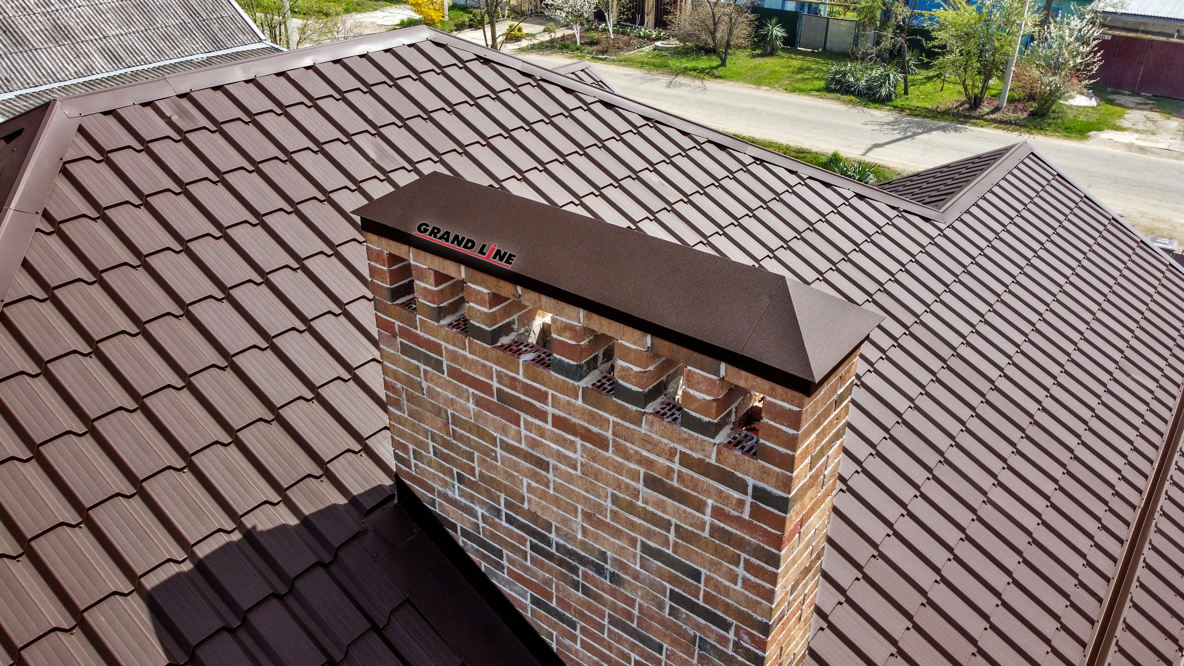 Темно-коричневый цвет добавит элегантности и стиля вашему дому, подчеркивая его индивидуальность. Металлочерепица Grand Line легкая в установке, прочная и долговечная, что делает ее отличным выбором для любого типа кровли.